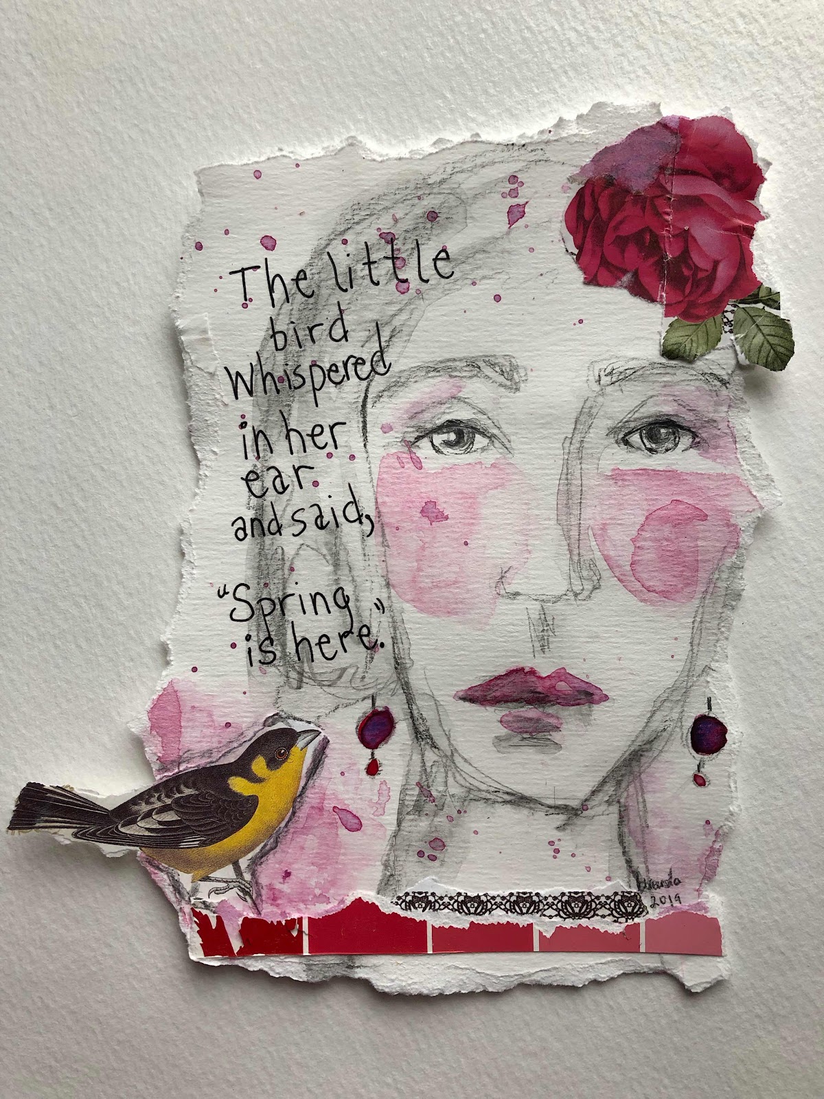 With thanks to Toni Burt for the fun lesson! I had loads of fun creating this woman’s face even though it isn’t something I would normally ever do. I do wish I had used heavier paper though. It must be the child in me, I enjoyed tearing the edges very much. The collage pieces came from a bar of soap wrapper and a paint swatch.
