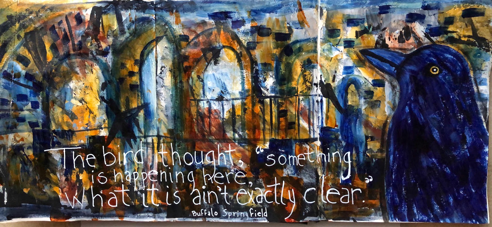 That is how I started my three page spread - black gesso, then there was too much black so I added white gesso before I applied some paint. I added Payne’s Grey, Quin Gold, Burnt Sienna and Anthraquinone Blue. I saw some birds on the page so I drew and painted my subject and collaged him down. The lyrics were the final touch. I’m happy with my results.