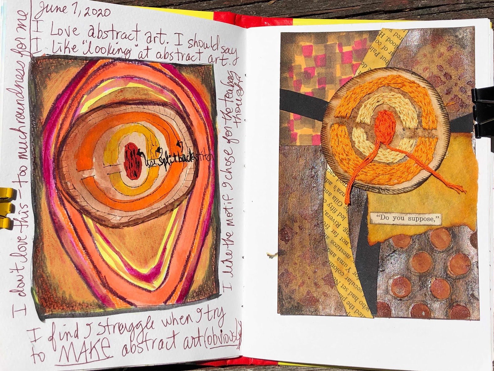 This one began in my sketchbook. The final result on the right. Textured stitching on a teabag, found text, book page, found papers, light molding paste and acrylic paint.