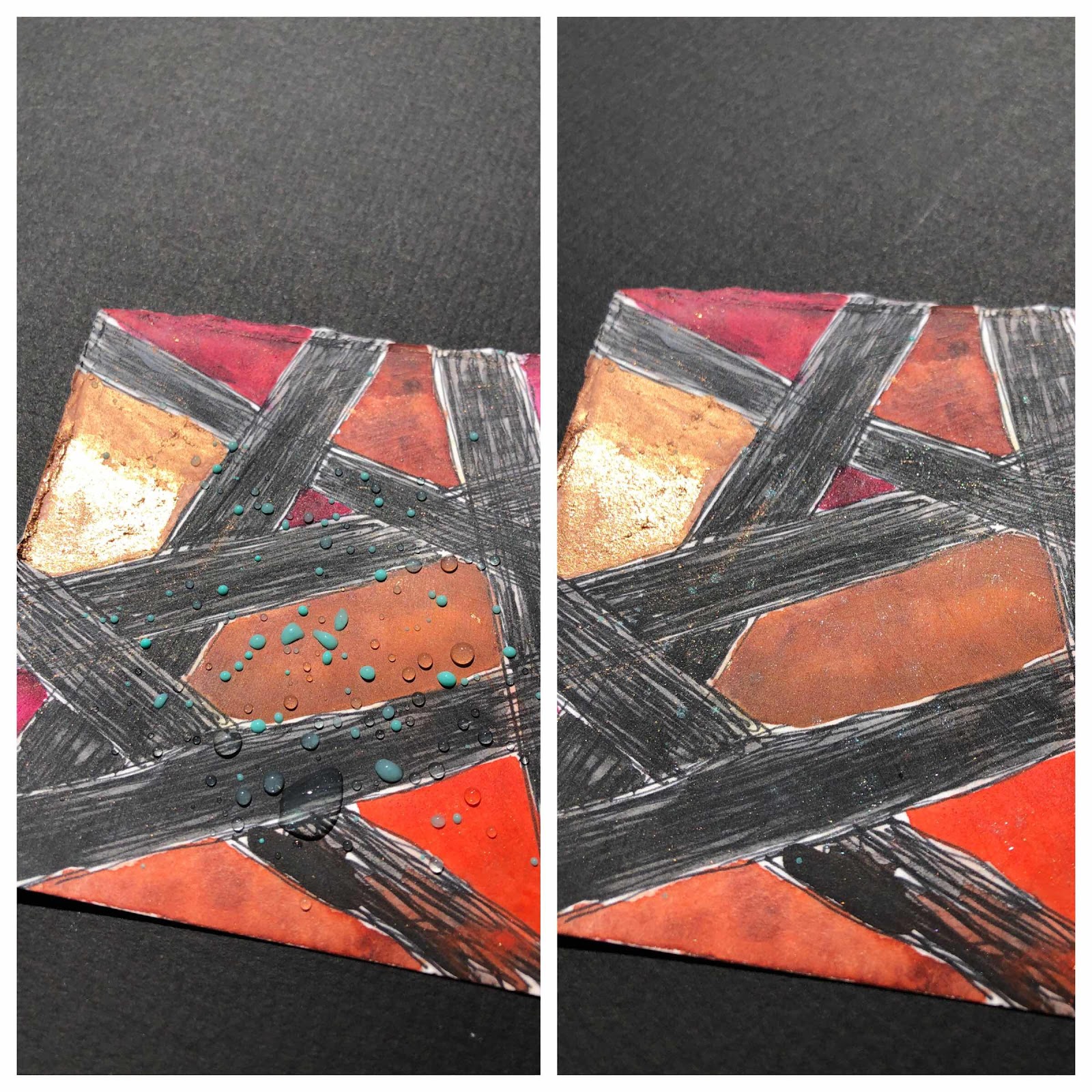I like to send artful snail mail and most of the time I have mail it out in an envelope because it is watercolour and I’m afraid it might become damaged in transit. This would work too if you wanted to frame and hang an artwork without the cost (and trouble) of getting glass cut. I saw this somewhere on Utube: they used Gamblin cold wax medium. I don’t have that so I used what I did have........Dorland’s wax medium. Yes it does work, this little trial piece is sealed. I used pen with watercolour over the top for this test piece. I had used some copper metallic paint too and as expected it became matte under the wax. I know it is obvious but I needed to try. I cleaned off the water and watercolour paint without harm to the painting below.