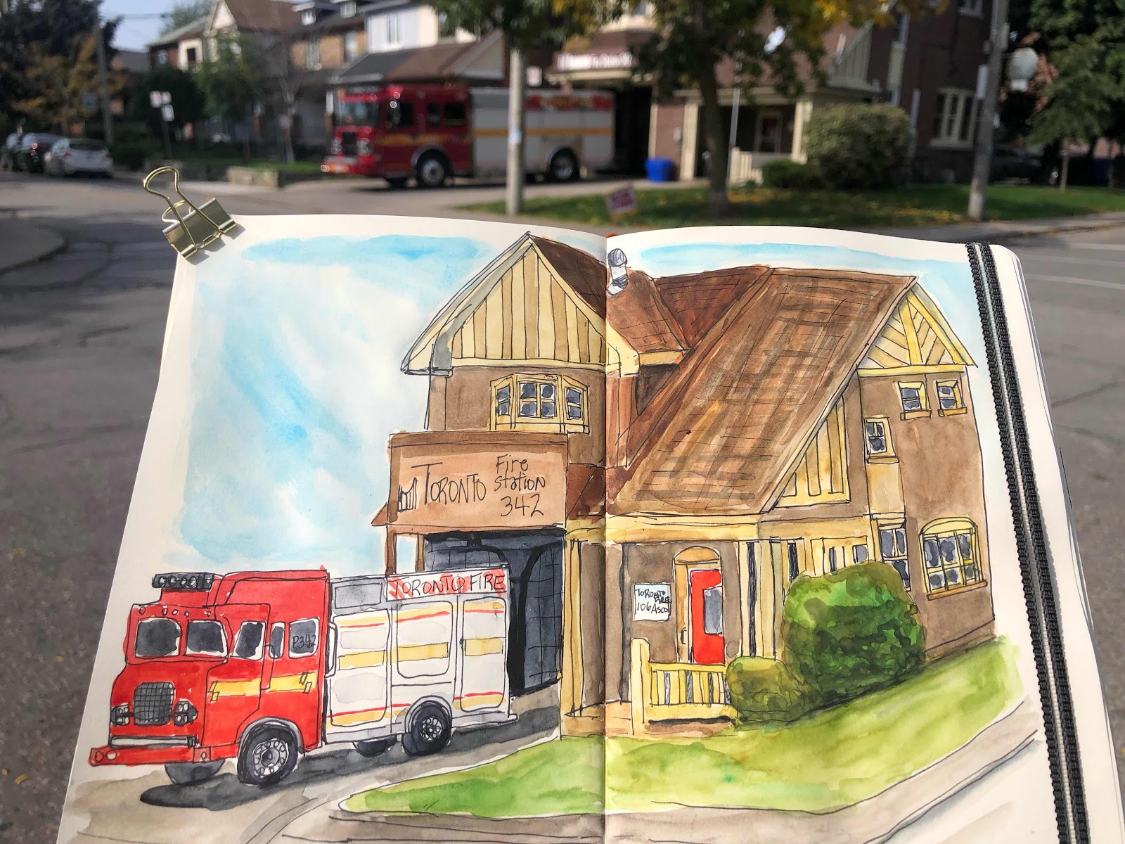 Pen only, no pencil drawing. I sat on a retaining wall but found it was infested with ugly red bugs so I drew and painted most of this standing up. So that means I made loads of mistakes that I couldn’t fix but I was able to “make it work”; the house looks like a house and the fire truck looks like one. I’m happy with this page.
