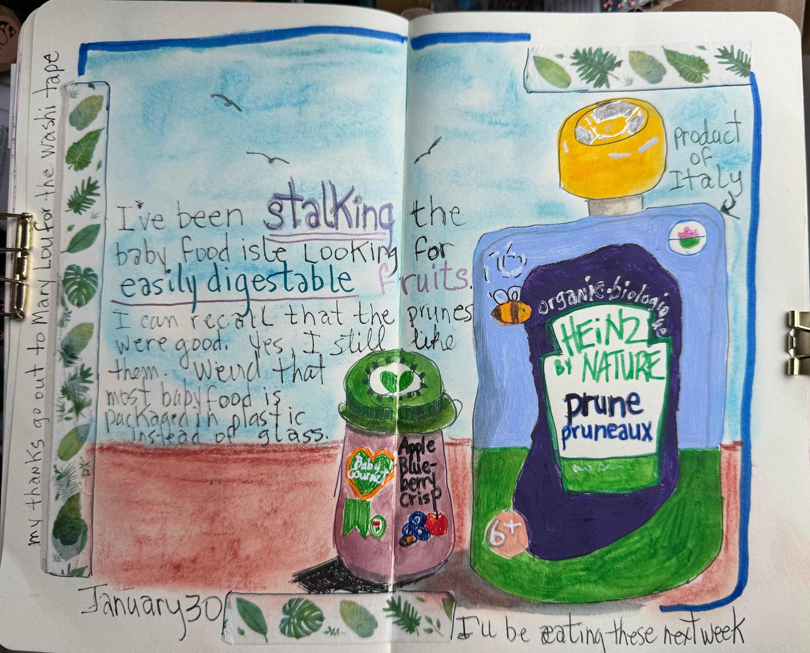 I don’t have any need to go down this isle but have used it as a detour to get to the back of the store. But I never actually “looked” at the products. I need to eat more fruit and remembered that I thought that the baby food variety wasn’t so bad. Yup, I can do it for 3 or 4 days until I get over the sickie stage. I was surprised to see that the prune puree is made in Italy. I guess we don’t grow enough plums here in Canada. I still think it is terrible that all that plastic is used for baby food. I only found one company that put their food in a glass jar.