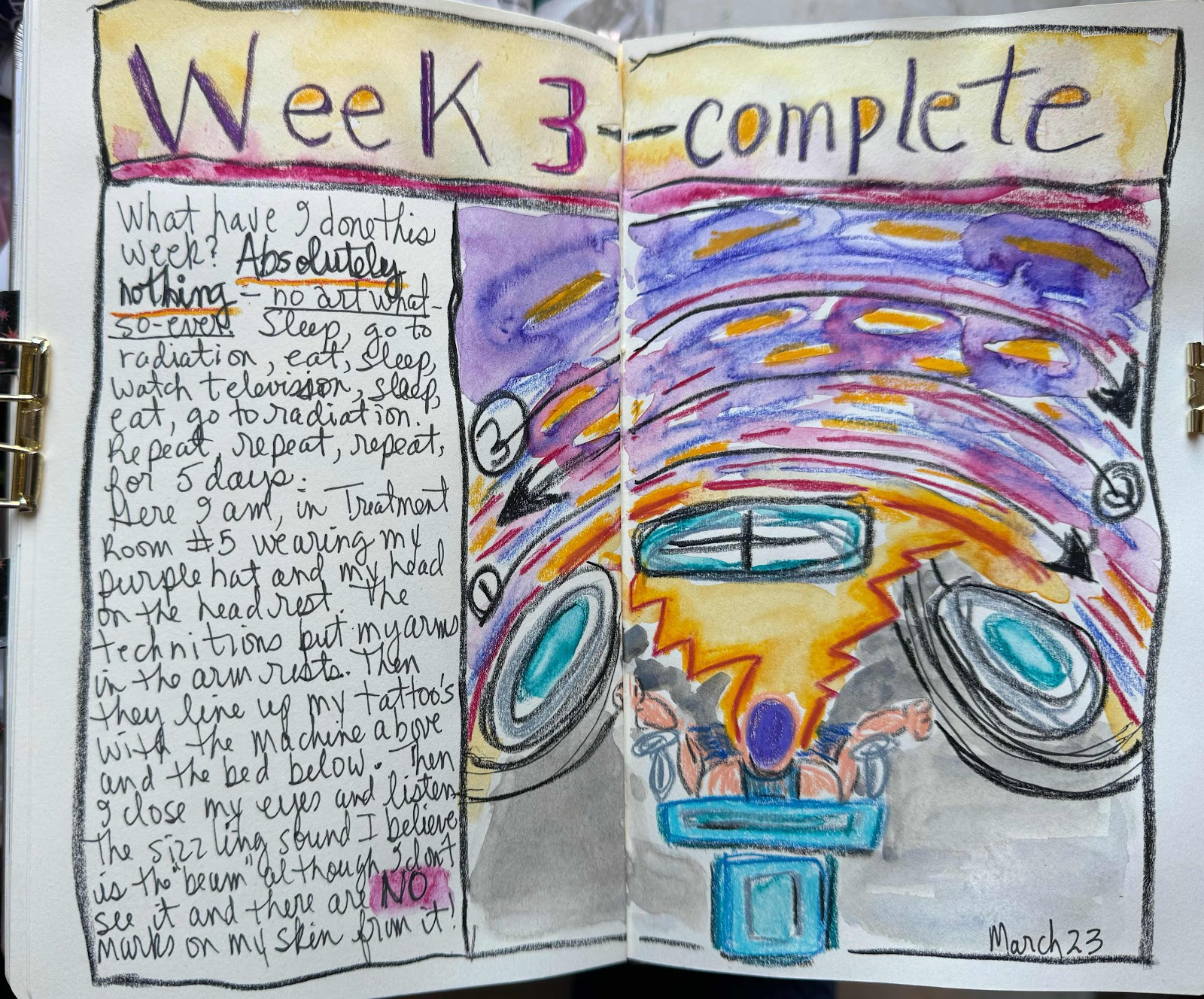 I don’t get a chance to really observe the room because I’m hustled over to the bed right away. Then they have to match up my tattoos to ensure I’m in position. The technicians are strong men and women. They do the movement, I just lay there as the move me. Then they move the bed a teensy bit too. Then they get the machine to scan me to ensure that I’m in fact going to get the treatment in the right places! I find that very comforting. It’s a balance between human and machine to ensure delivery of the radiation therapy is going to the right places. What a noise though; the whirling, banging, shuddering and sizzling!