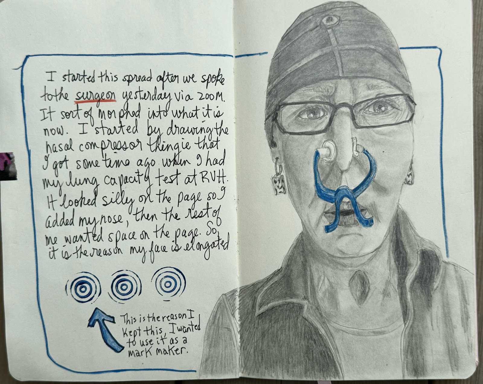 This is what I wore while we spoke to the surgeon during the zoom meeting yesterday. Once that was done I turned to my sketchbook with the intention of drawing my new mark making tool that I got from the lung capacity test I took some time ago. The nurse didn’t bat an eyebrow when I asked to keep it; she said she was going to throw it away. I didn’t like what I saw on the page so I added a nose; because I thought it needed context. I didn’t like that so I switched the the camera on my iPad and added myself into the drawing. This resulted in my face getting too long. Oh well, I made a page. I cut the blue plastic and used some acrylic paint to stamp on to the page.