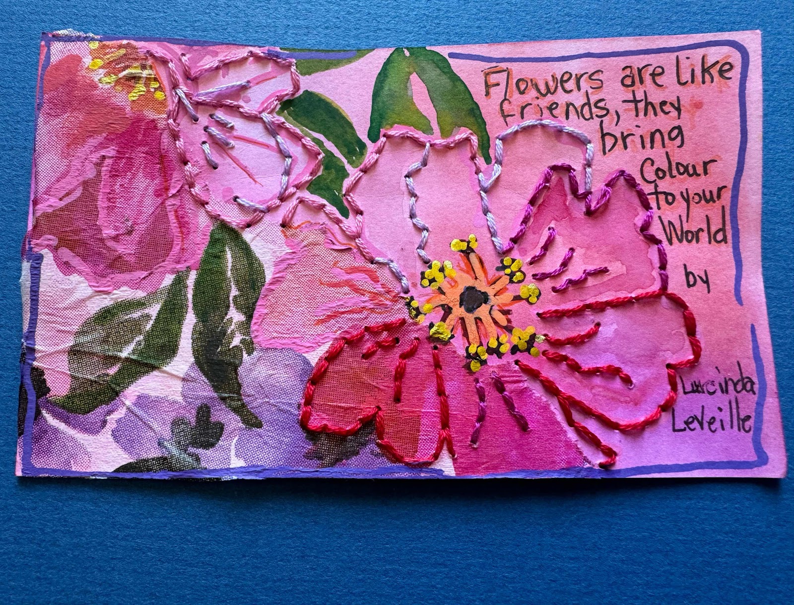 I really like this quote; “Flowers are like friends, they bring colour to your world”! The card colour was created using bleeding tissue, then I collaged on the napkin. I completed the large flower with stitching and some green leaves with watercolour. The petals looked kind of boring so I added some colour to some of them as well. I dug out some acrylic markers to make some marks.