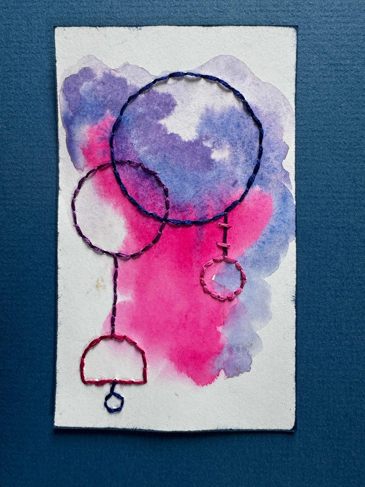 June 7th- I’ve been looking at this card that I had put some watercolour paint onto all this week. I had thought it might end up in the discard pile, then it dawned on me: circles! Decided I needed another shape for interest sake.