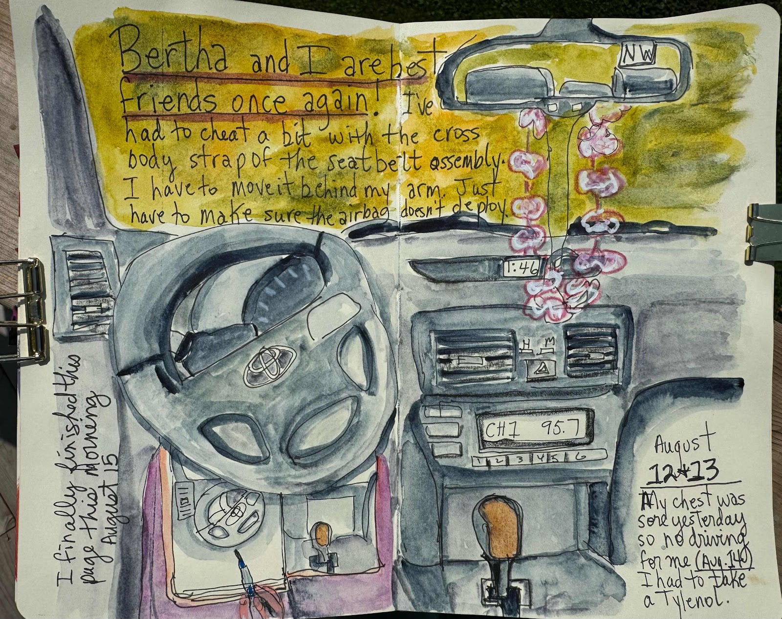 Another MILESTONE achieved! I’ve made friends with Bertha again this week. I have to admit though that I don’t wear the seatbelt assembly properly. I just fling the cross body strap behind my arm. I can’t stand anything touching my chest. It’s “good enough” for me, I need my freedom! I drew this on Monday just before we drove to the small city to the north of us. It isn’t a grand depiction but it’s “good enough”!! The yellowish green in the windshield represents the cedar trees that I park in front of and the yellow in the rear view mirror is the trees and bushes at the back. I didn’t want to make them too dark as in real life because I wanted to write in that space. I guess I could darken the rear view mirror reflection but I’ve turned the page already.