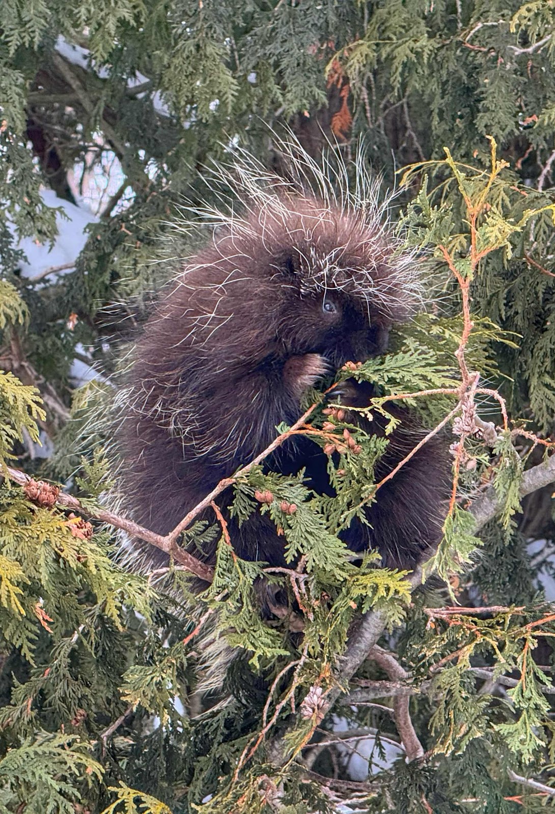 The first time we saw the porcupine in this cedar tree he/she was about 30 feet up, today he was only 10 feet up. He wasn’t bothered by me at all. Bertha is parked farther out from the tree. I had to put her back in her normally parking spot because our snow blower dude will be coming by early in the morning. We are waiting for another major snow dumping by Mother Nature. I’ve put a photo down in the comments. You can see his eye and paw!!