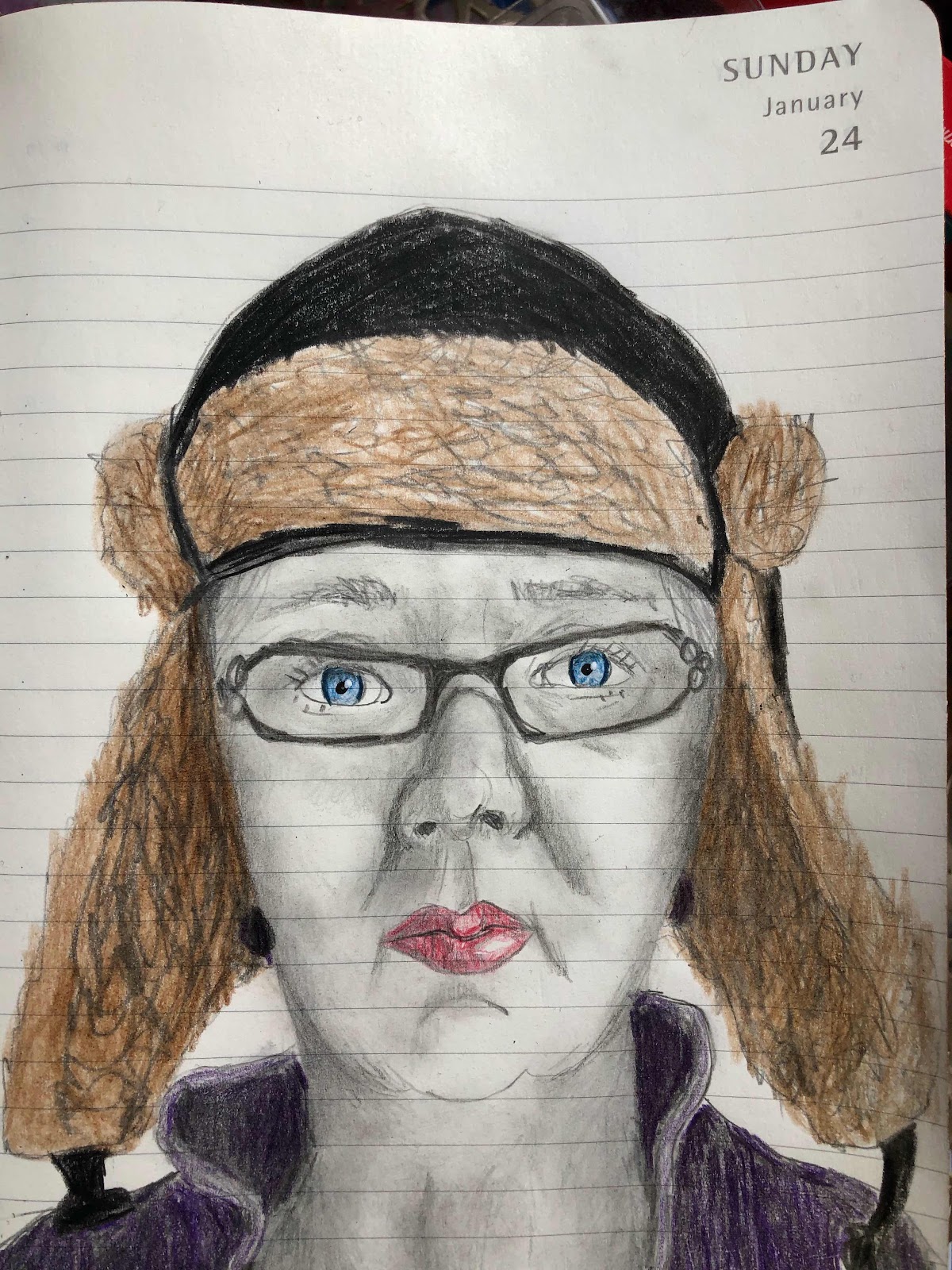 Good morning! It is Selfie Sunday once again!I’m watching the wild turkeys out the window this morning while I draw and drink my coffee. This selfie is a mash up of kiddo and artist pencil crayons: graphite, oil and wax in my Moleskine planner.