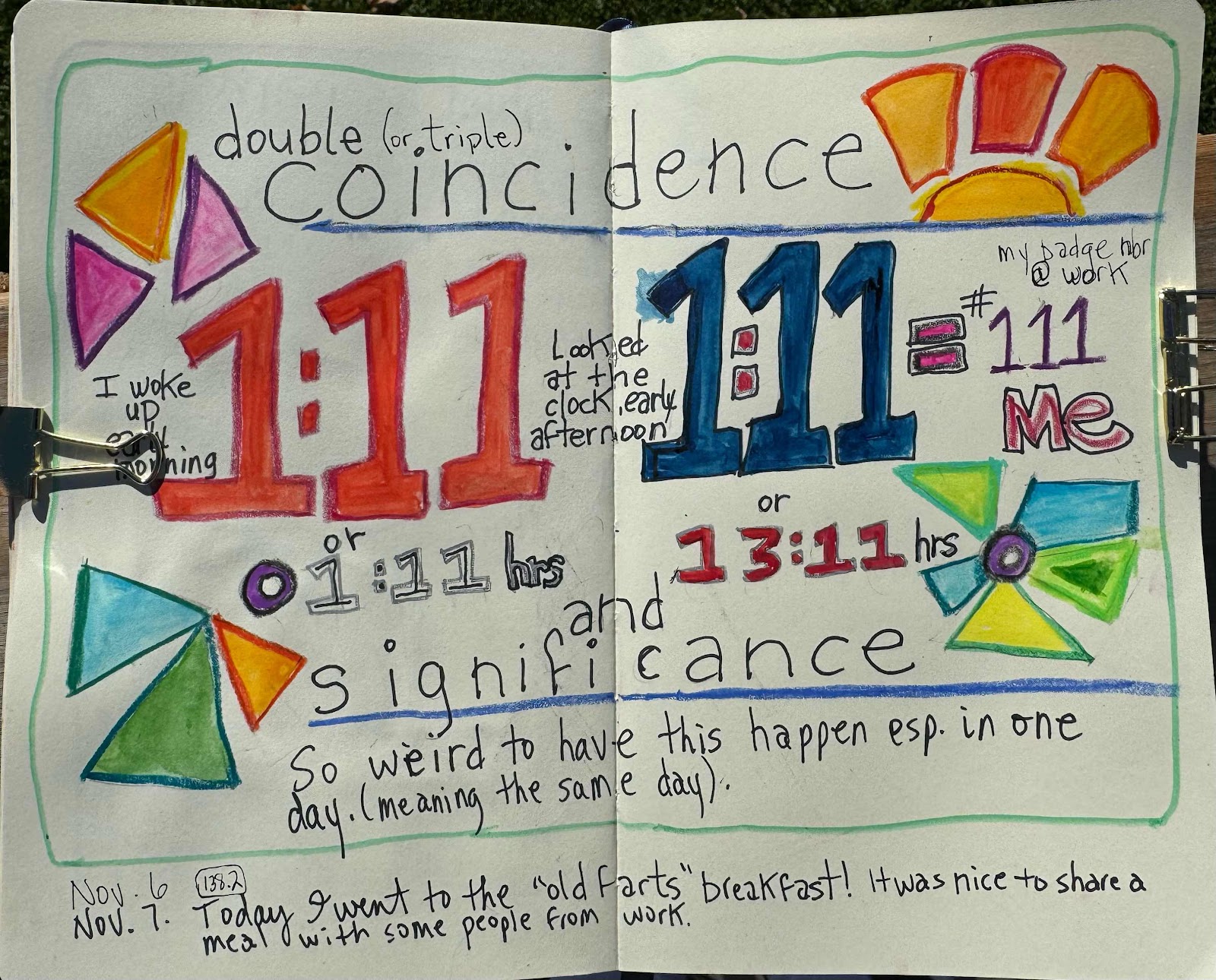 So weird! I’m not much for coincidence so I couldn’t help but notice this one. I’m not into numerology so I don’t know if there is another way to understand what this might mean. I don’t have a “lucky” number per se since I’ve never won a lottery. For me, it’s just a simple coincidence that my employee number at work was 111. Could be that I had the “old farts” (retiree) breakfast on my mind. Who knows. I created a page in my sketchbook.
