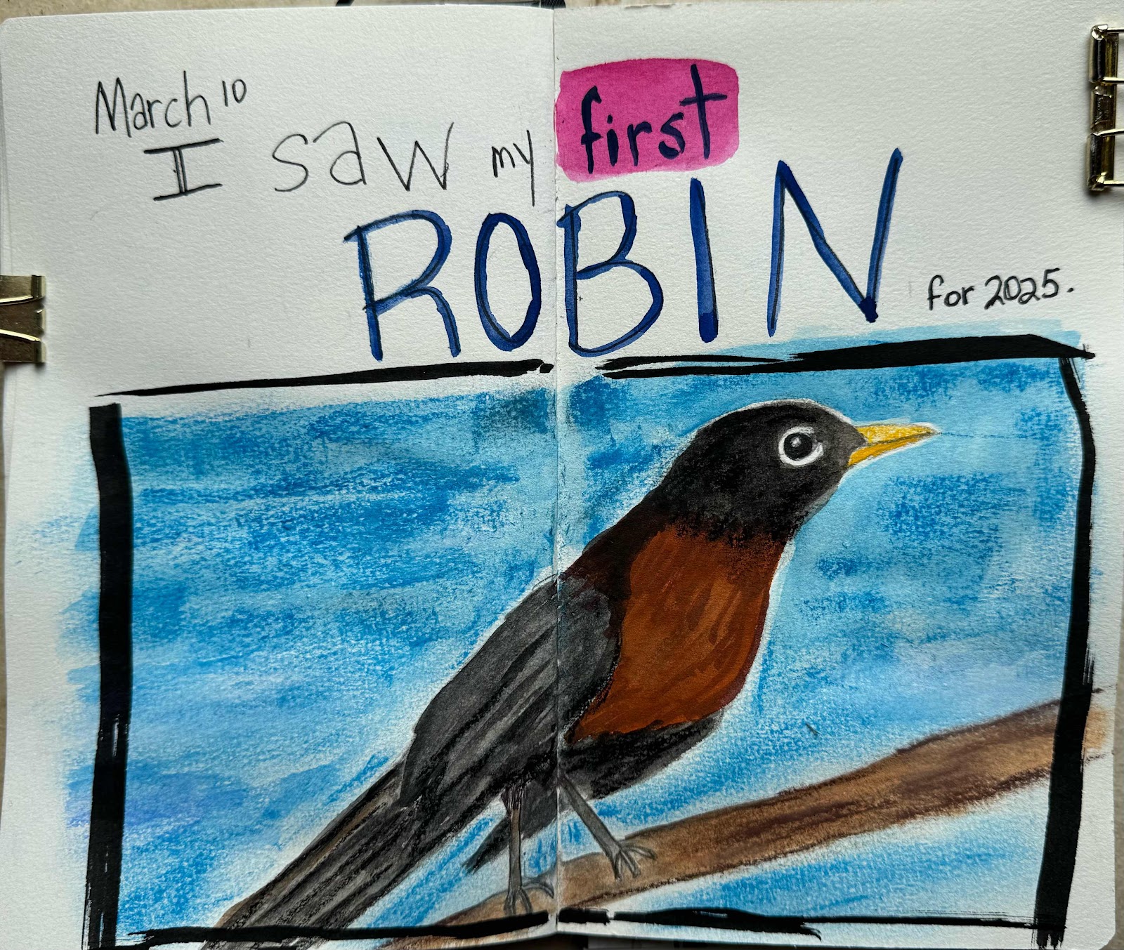 I was thrilled to see my first robin who is our harbinger of spring. After this horrible winter, I am more than happy to know spring is around the corner. The red wing black birds are back too (although it is too soon for them to show their colours). I love hearing their twittering at the bird feeder. This page is from a photo I took.