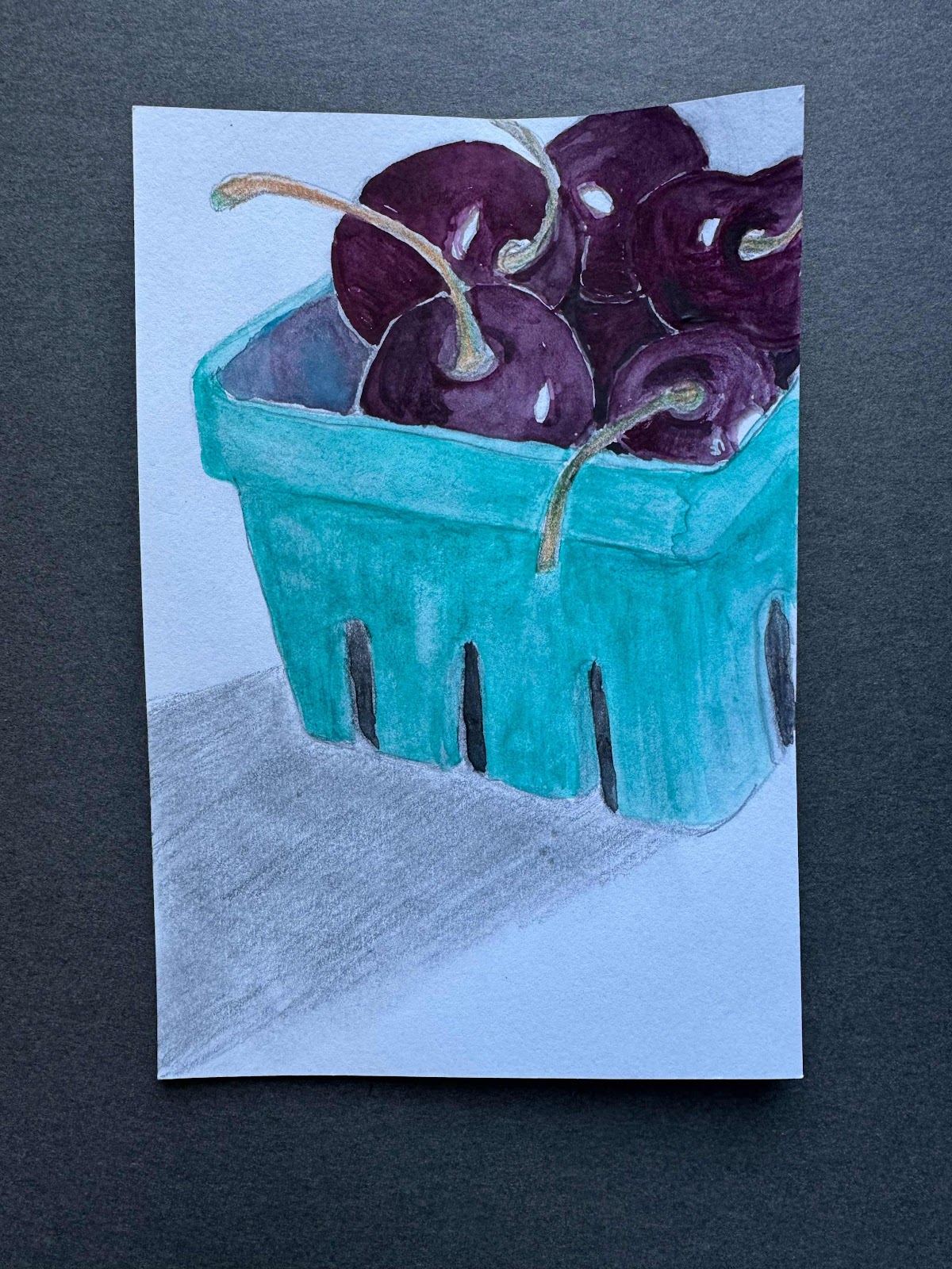 I’ve really enjoyed painting with the cobalt turquoise paint. It just so happened that the little carton is that same lovely colour. Cherries have been exceptionally good this year!